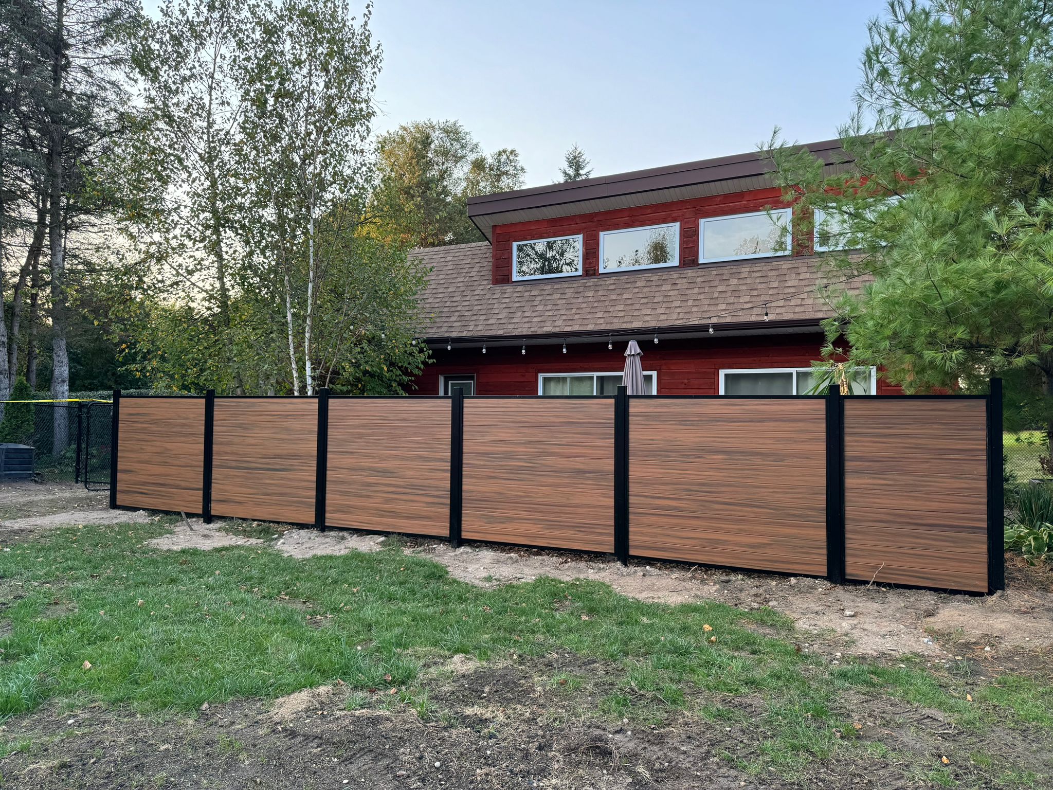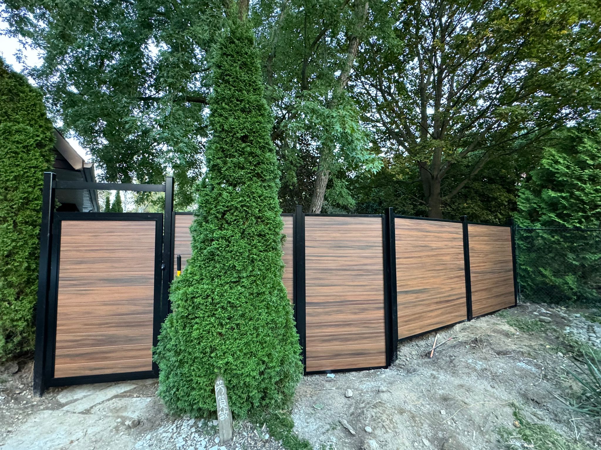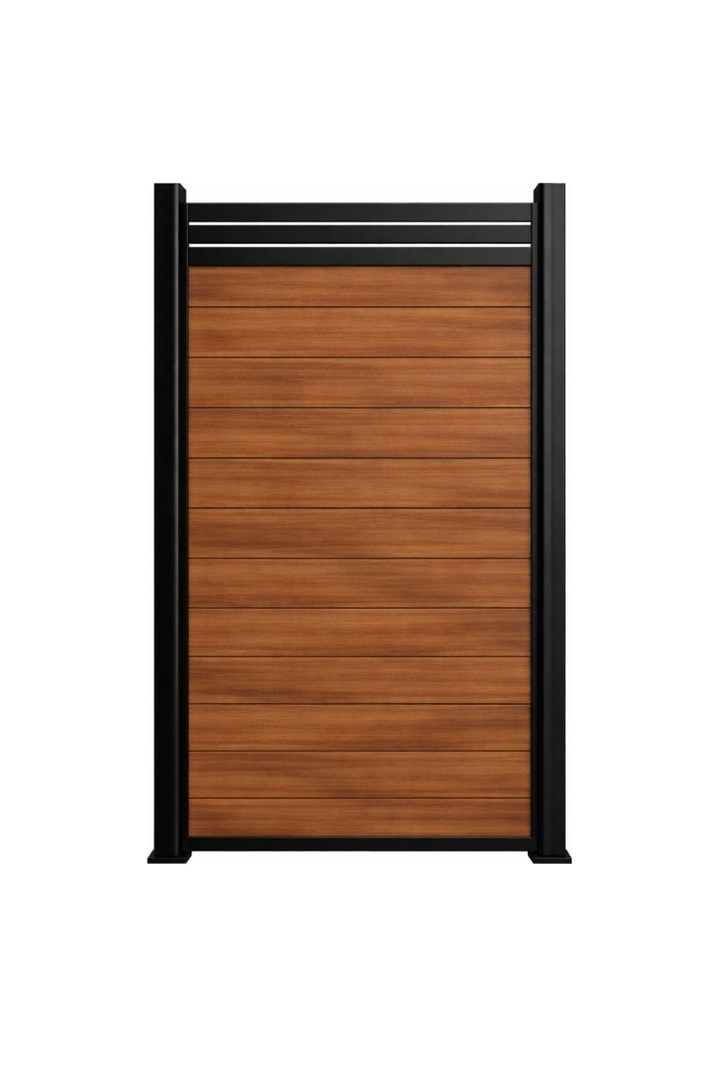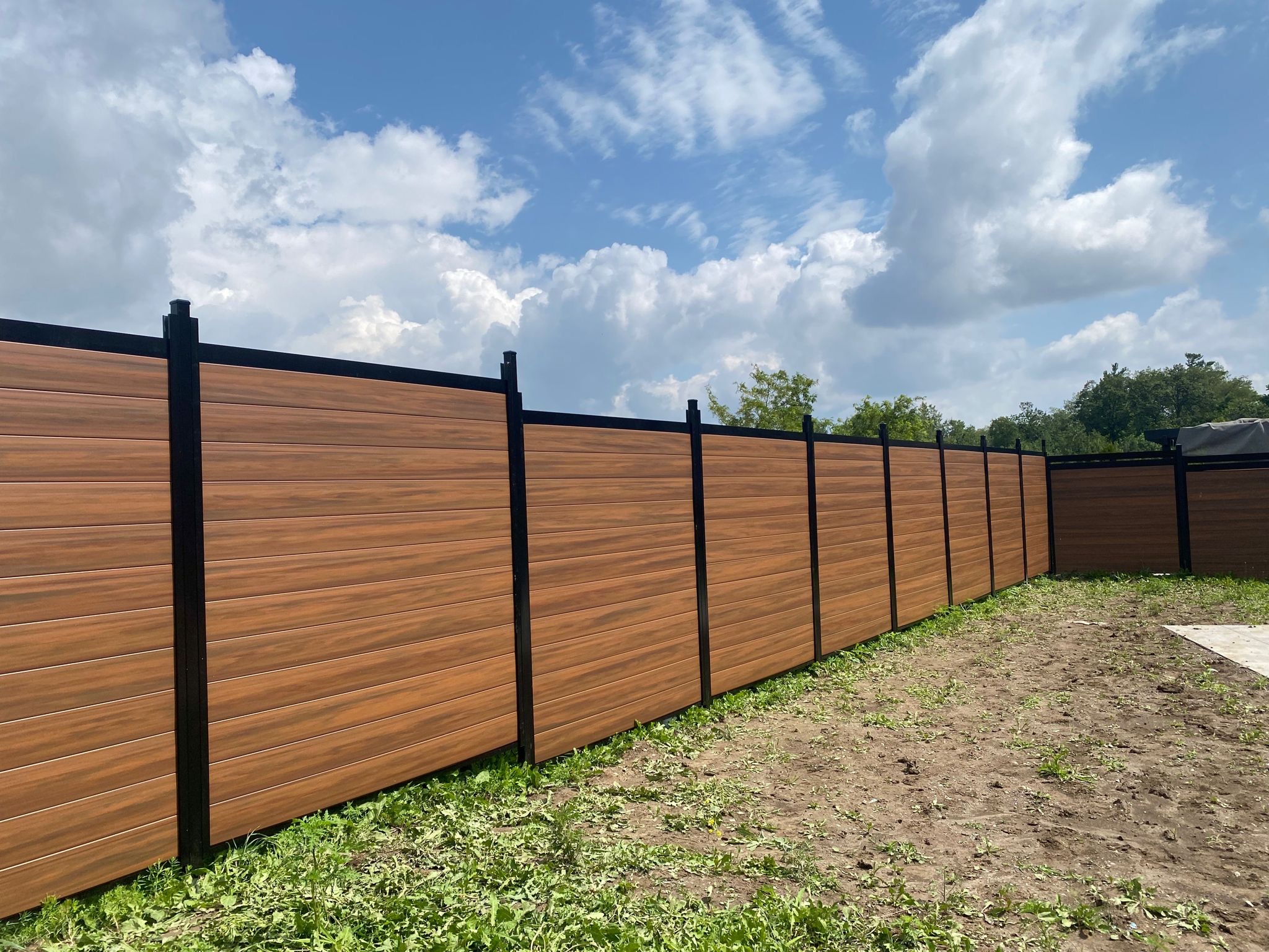 Built for Canadian outdoor living. The Mocha Walnut privacy screen features premium vinyl infill panels in a natural wood-grain grey finish, framed in a durable black aluminum post and channel system. Designed to withstand harsh weather without warping, cracking, or fading.